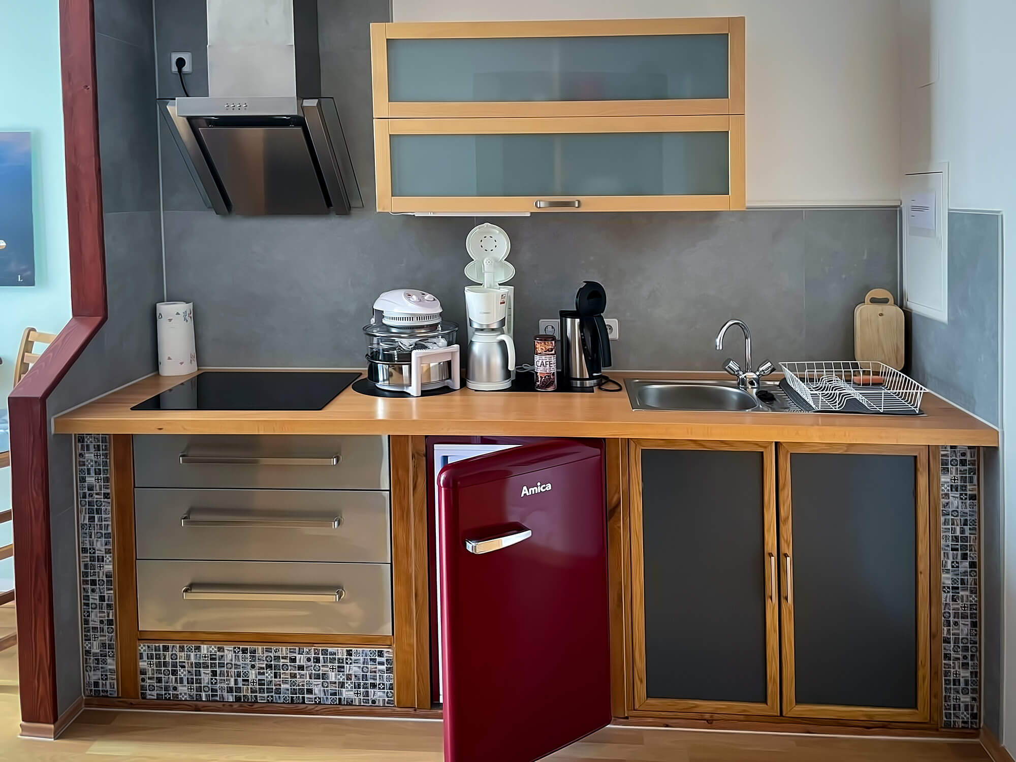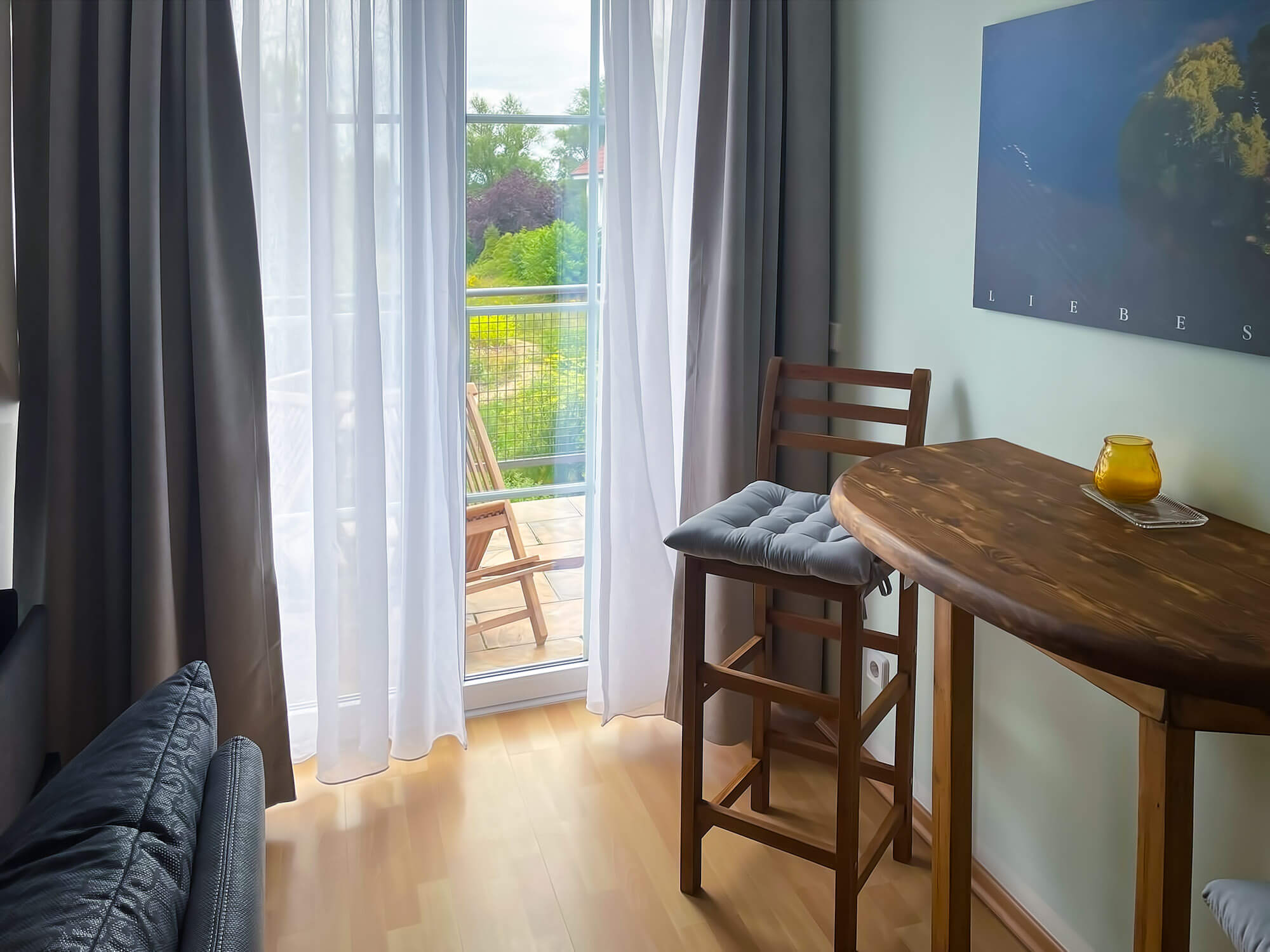 Dieses 1-Zimmer-Apartment bietet eine voll ausgestattete Küche, einen Hochtisch für zwei Personen, eine gemütliche Wohnzimmer-Couch, ein separates Schlafzimmer mit Doppelbett, ein modernes Duschbad sowie einen Balkon.